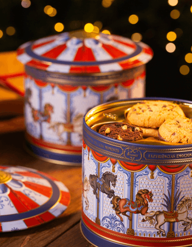 Essa embalagem especial, é feita de lata,com uma tampa mais que especial, quando acionada, também toca uma música natalina. Acabamento perfeito, e a Biscoitê sempre pensa em uma forma das nossas embalagens se tornarem um item de decoração e reutilização na sua casa.